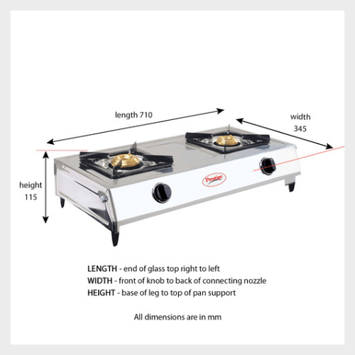 • Gas stove type: Manual; Burner material: Brass; Size of the burner: 1 Small, 1 Medium; Material of the body: Stainless Steel; Material of the top: Stainless Steel-Top; Size of the gas stove (in cm): 69x37x15; Colour: Silver