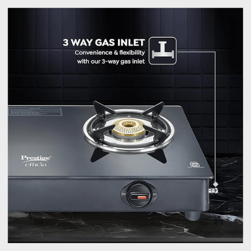 The **Prestige Efficia LP Gas Stove** features a sleek powder-coated body with a durable toughened glass top for enhanced aesthetics and longevity. Equipped with **2 high-efficiency brass burners**, it’s perfect for compact kitchens and daily cooking needs.
