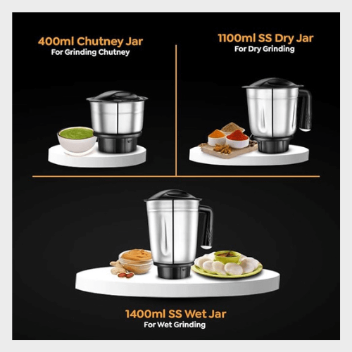 - Contents: 1 Mixer Grinder Base Unit, 1 Ss Wet Jar 1400Ml With Blade, 1 Ss Dry Jar 1100Ml With Blade, 1 Ss Chutney Jar 400Ml With Blade, Spatula, User'S Manual, Warranty Card